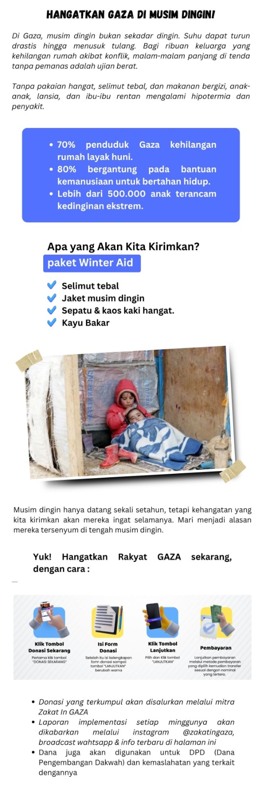 Tim Zakat In Gaza masih terus membuka kesempatan bagi Sahabat Gaza sekalian yang ingin menitipkan kebaikannya untuk mendukung bantuan Winter Aid bagi saudara-saudara kita yang terdampak di Gaza Palestina.